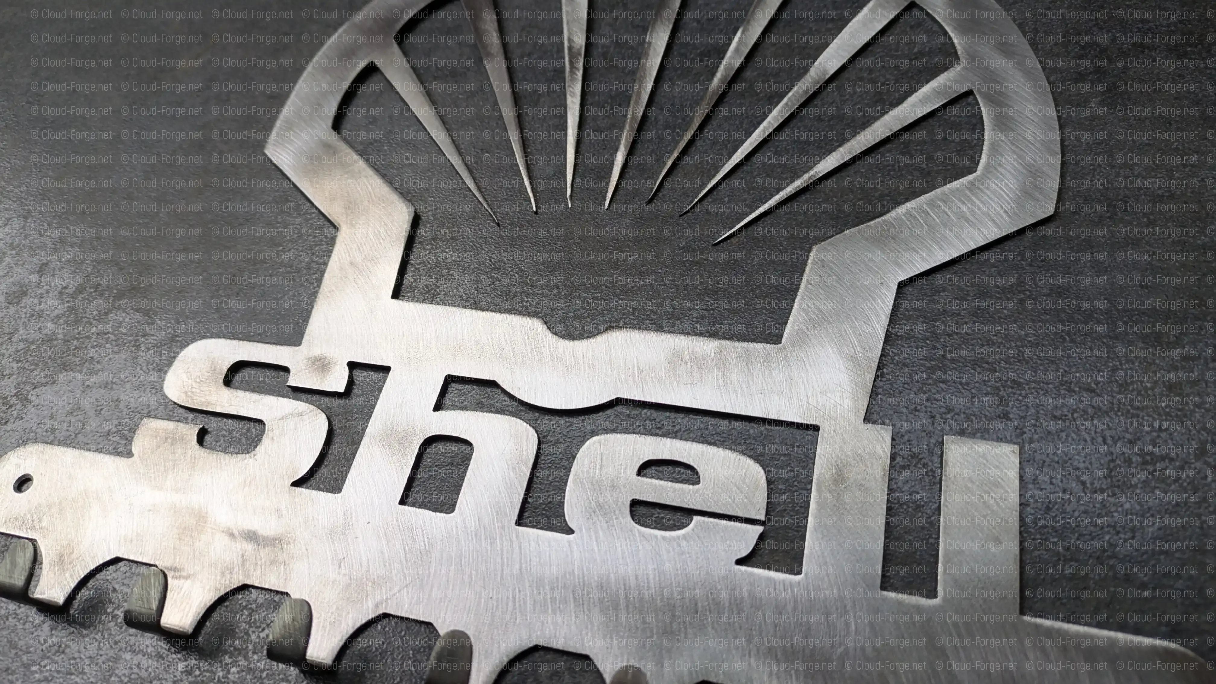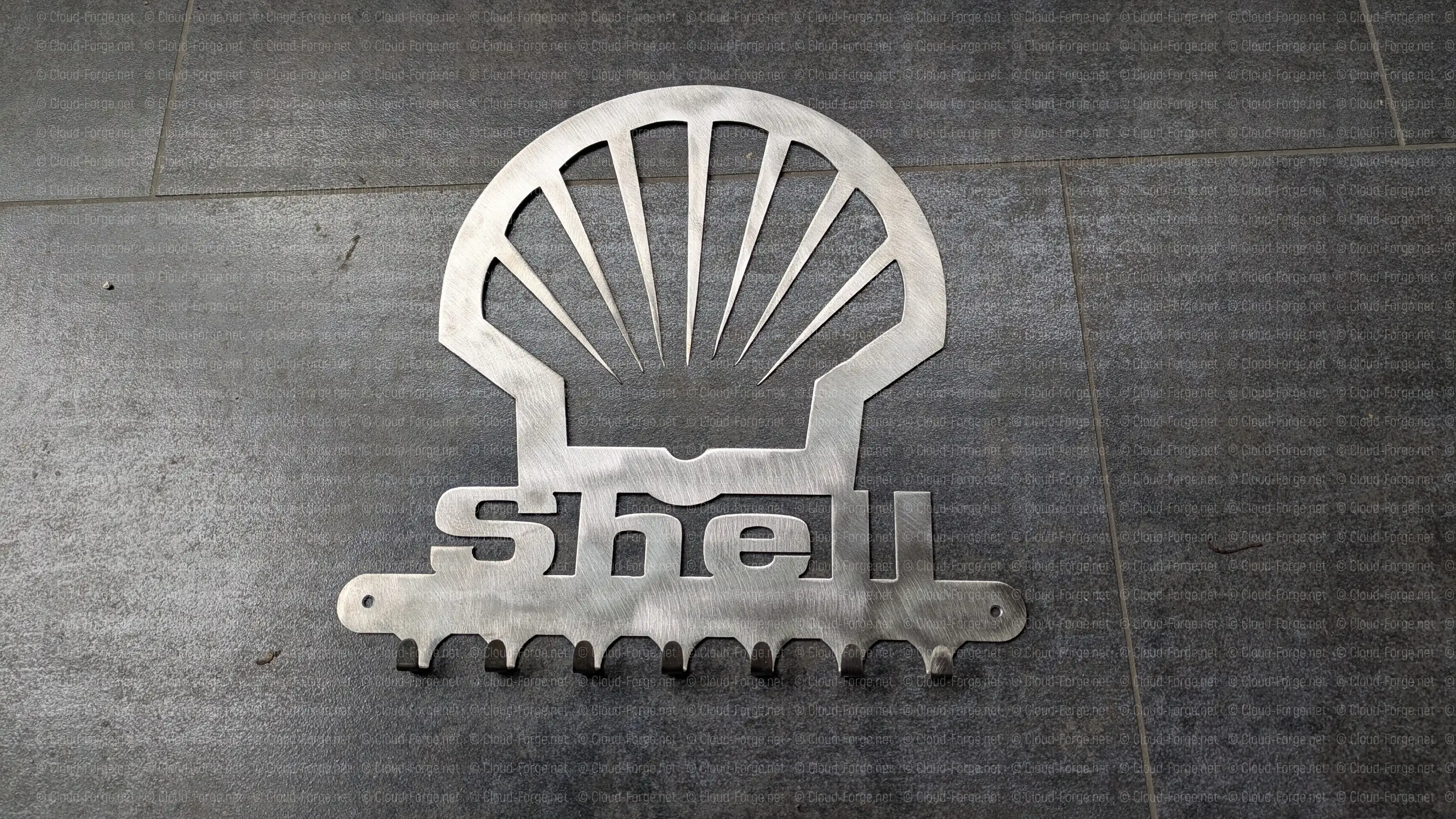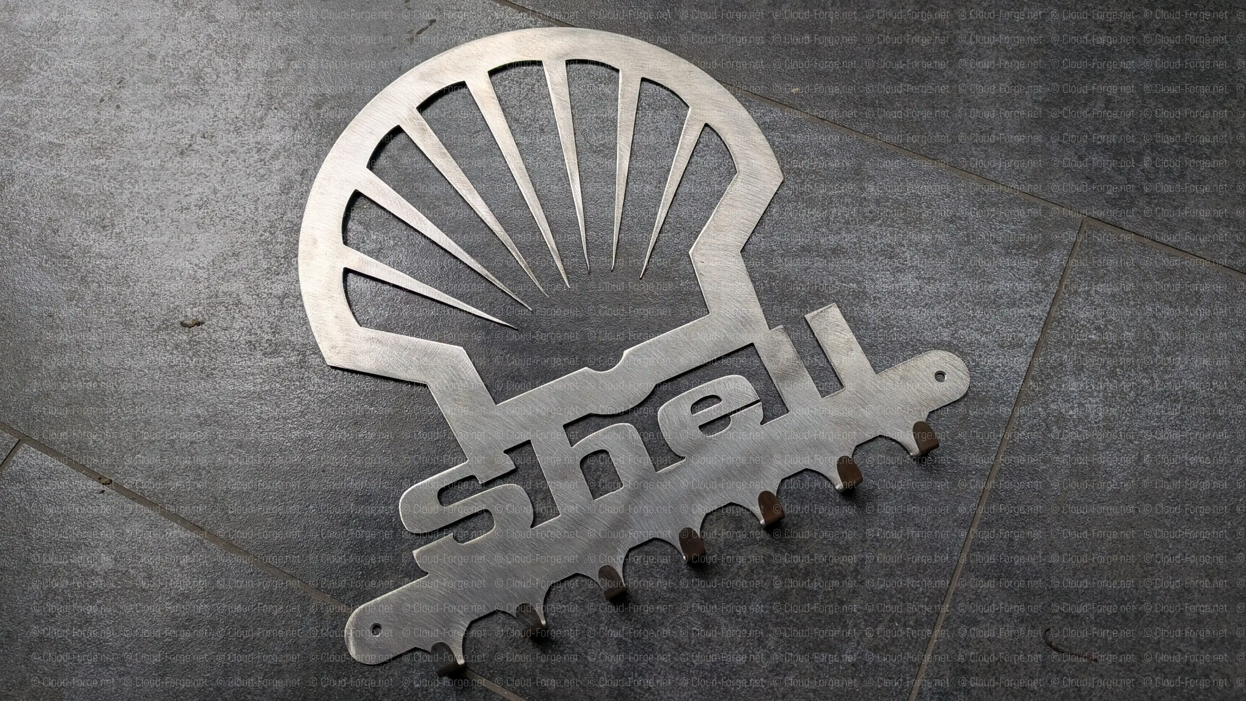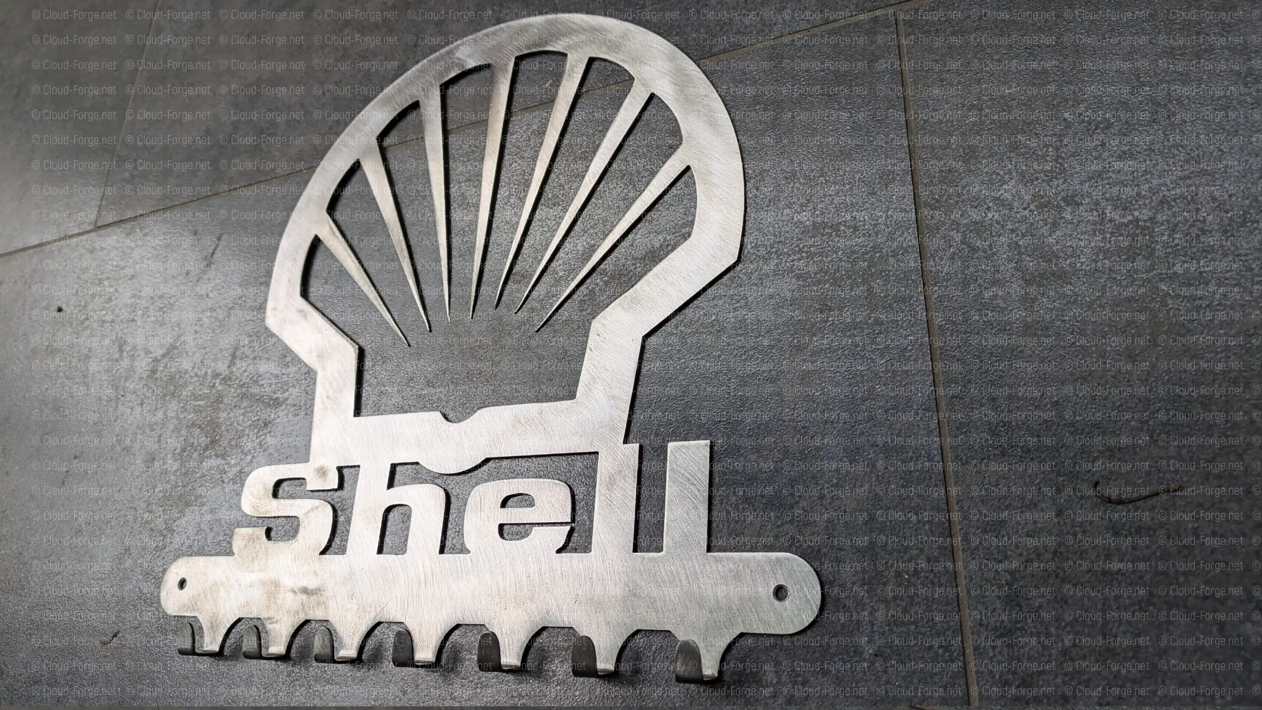 La coquille Shell découpée dans l’acier — le plus grand format de la gamme (30 × 28 cm) pour un impact visuel maximal.