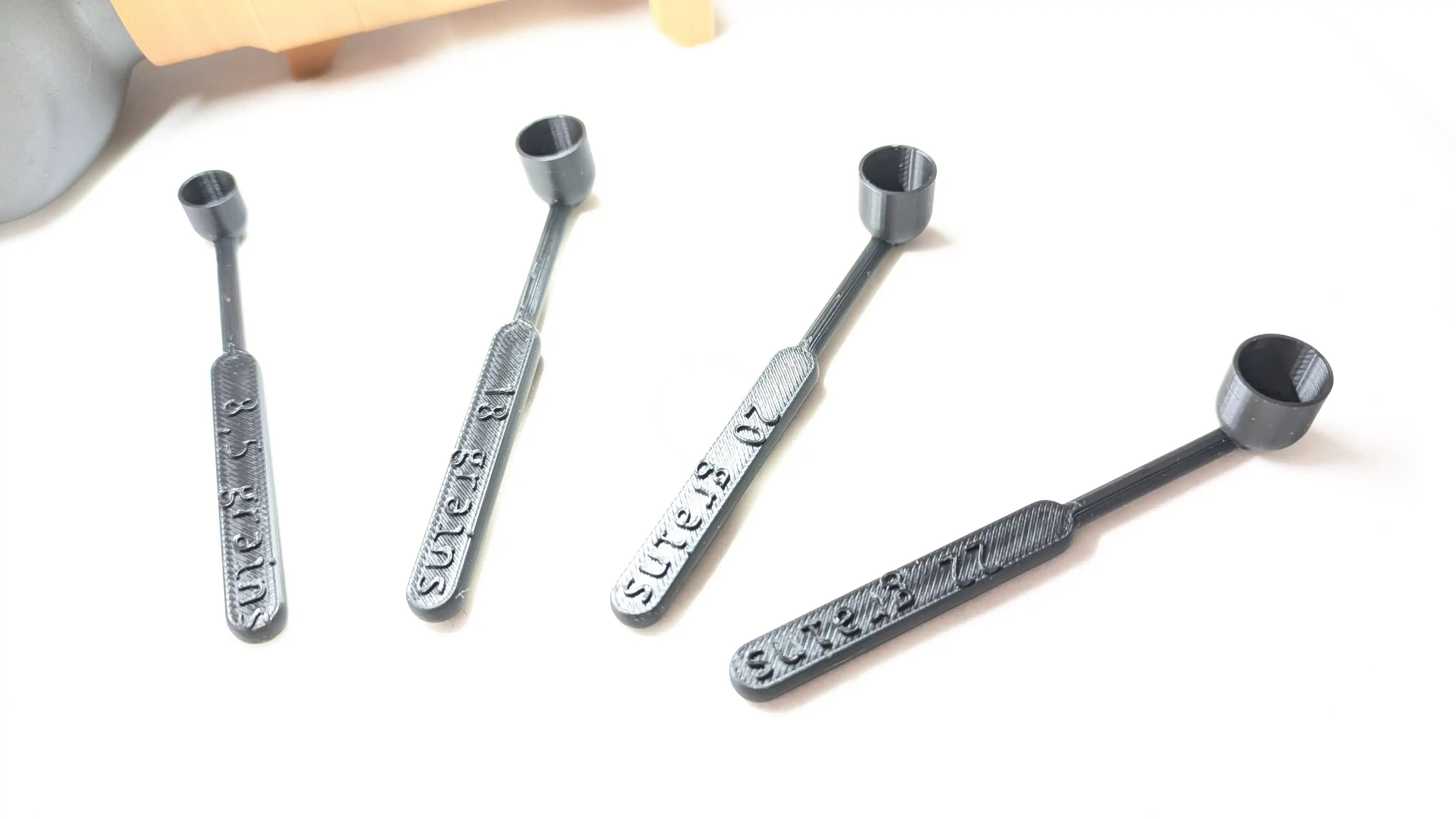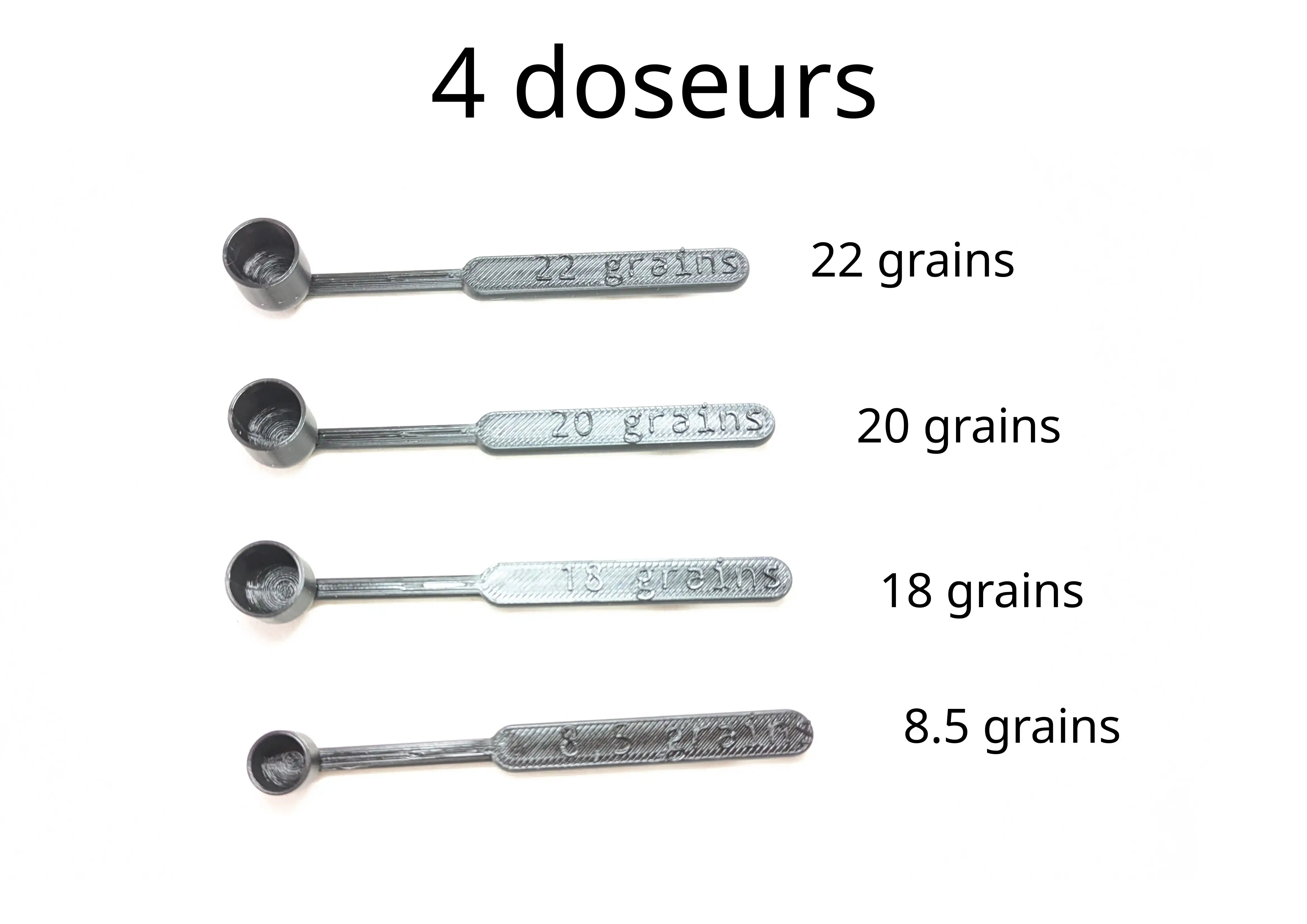 4 dosages calibrés pour couvrir les charges courantes des revolvers à poudre noire — chaque cuillère est marquée et identifiable au premier coup d’œil.