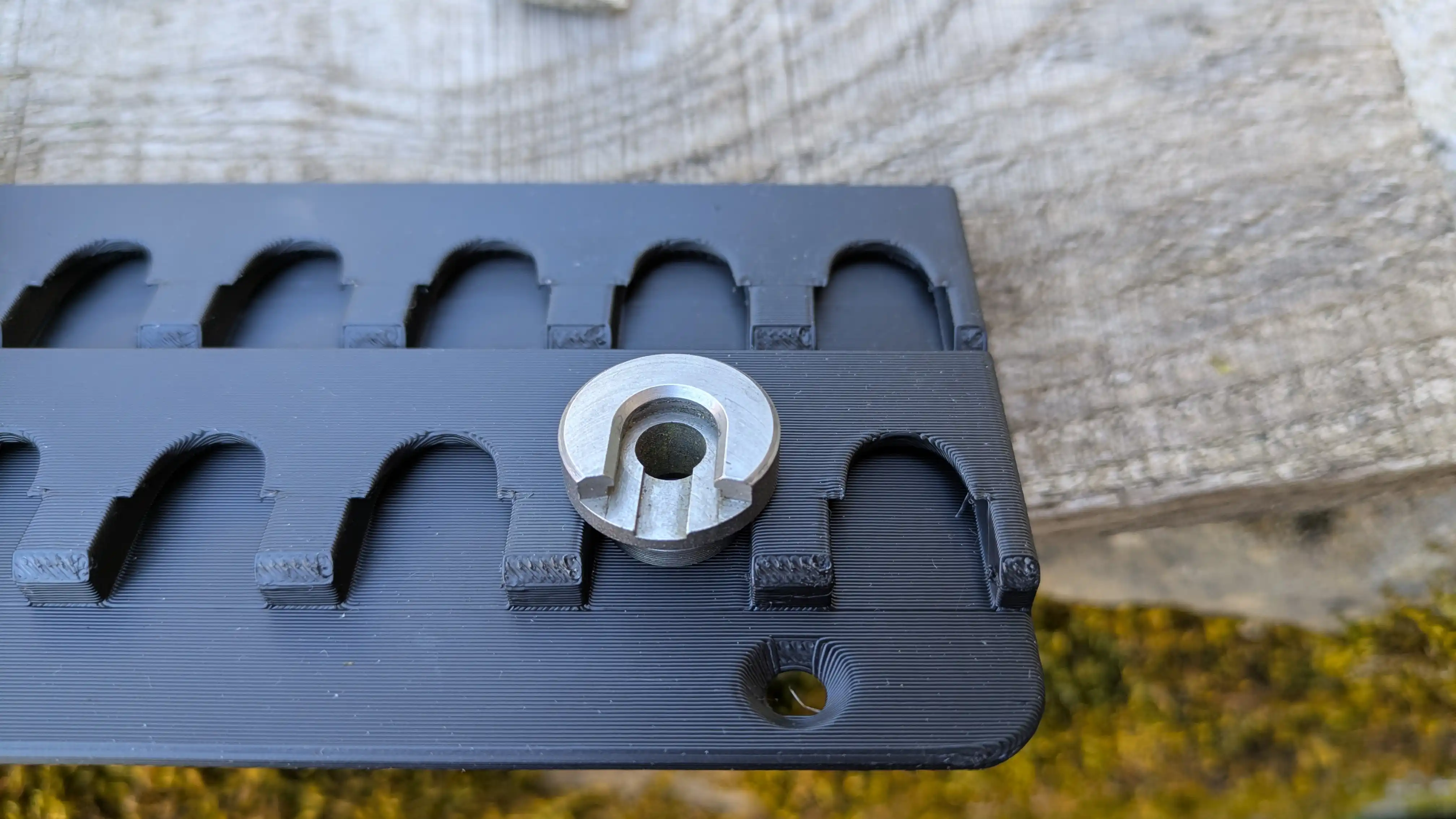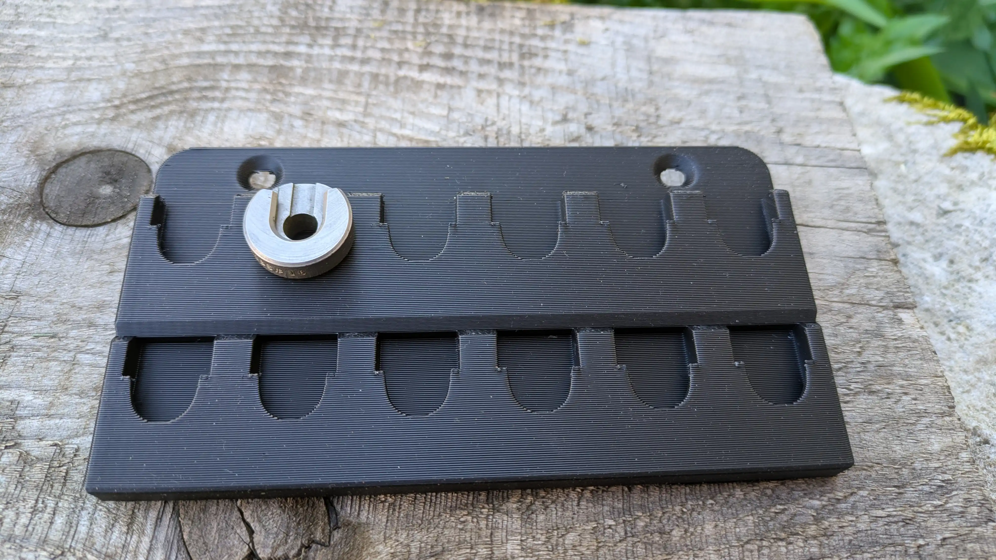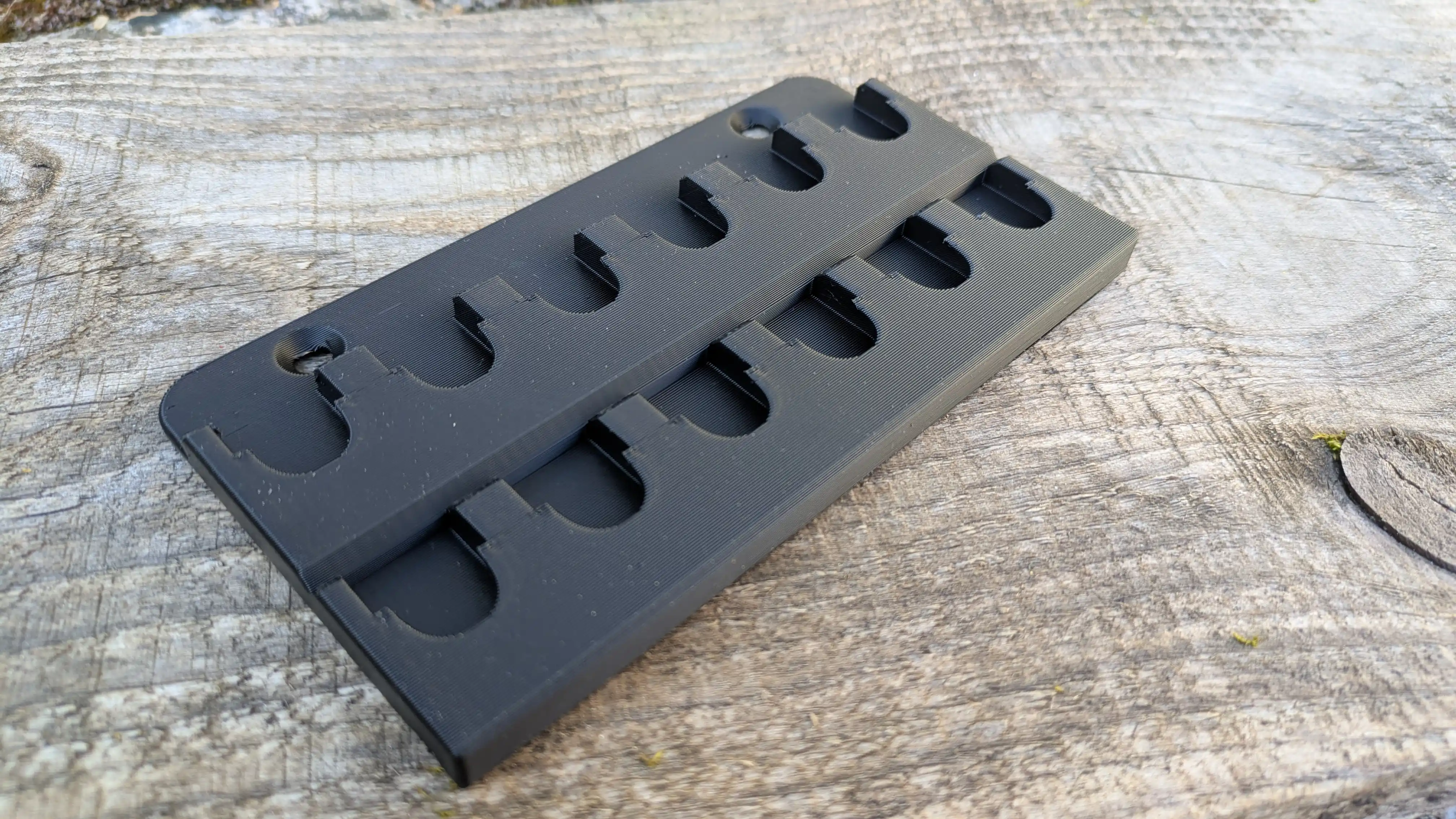 Support mural compact pour ranger 12 shell holders (supports de douille). Fixation rapide par 2 vis, vos shell holders sont visibles, accessibles, et ne traînent plus dans une boîte en vrac.