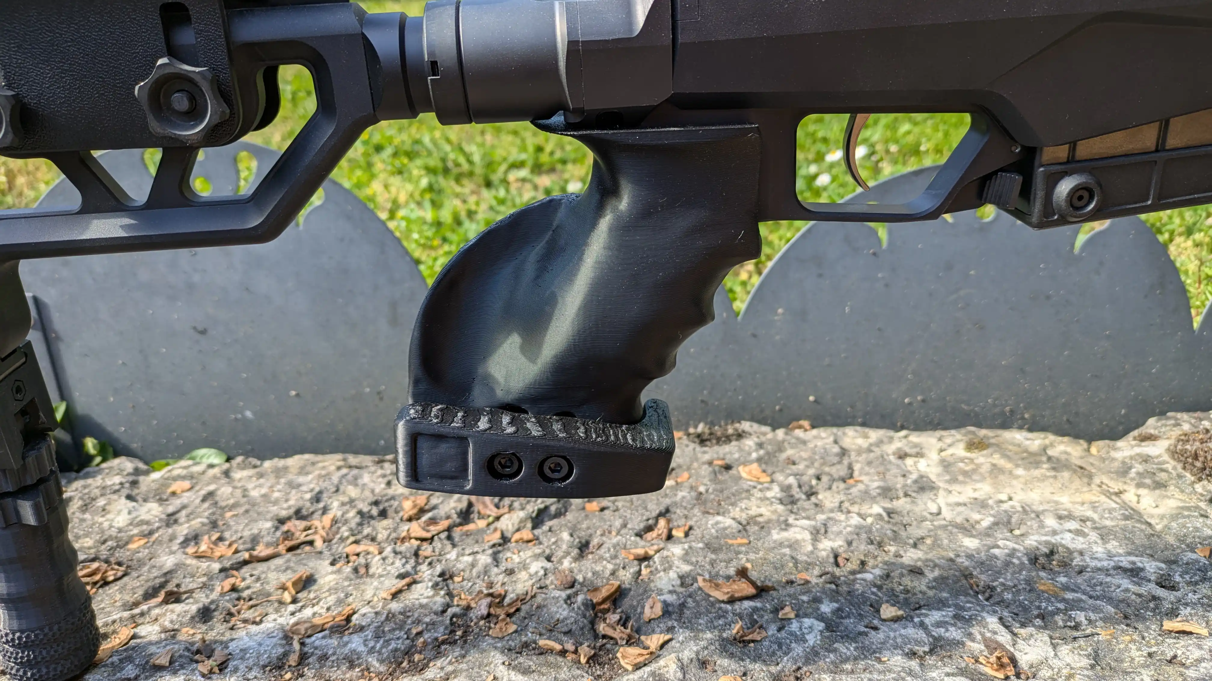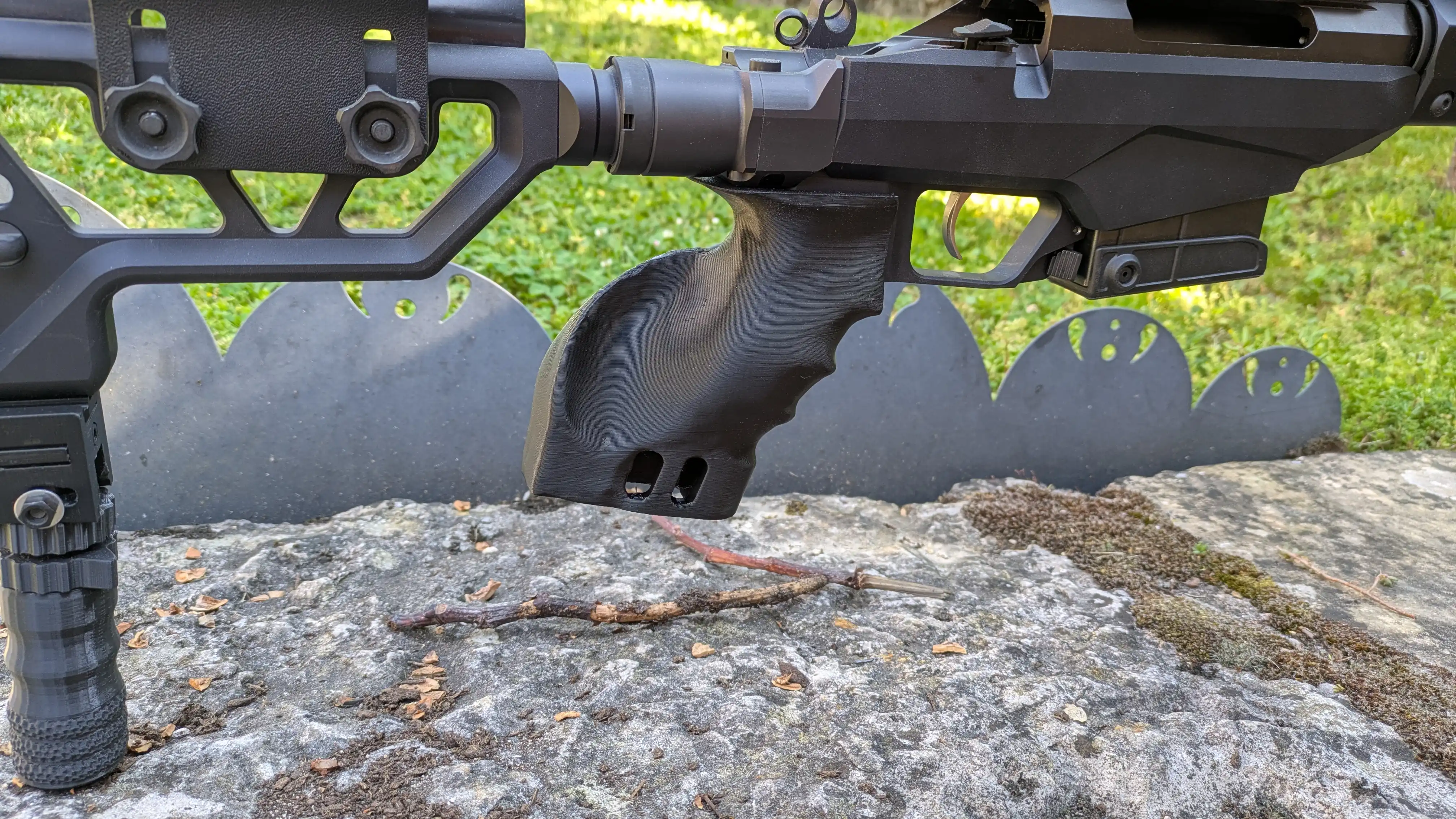 Dessinée spécifiquement pour le châssis T3x TAC A1, elle offre une prise en main verticale type AR-15 qui améliore l’alignement du poignet, réduit la fatigue sur les longues sessions et permet un meilleur contrôle de la détente en position bench-rest ou TLD couché.
