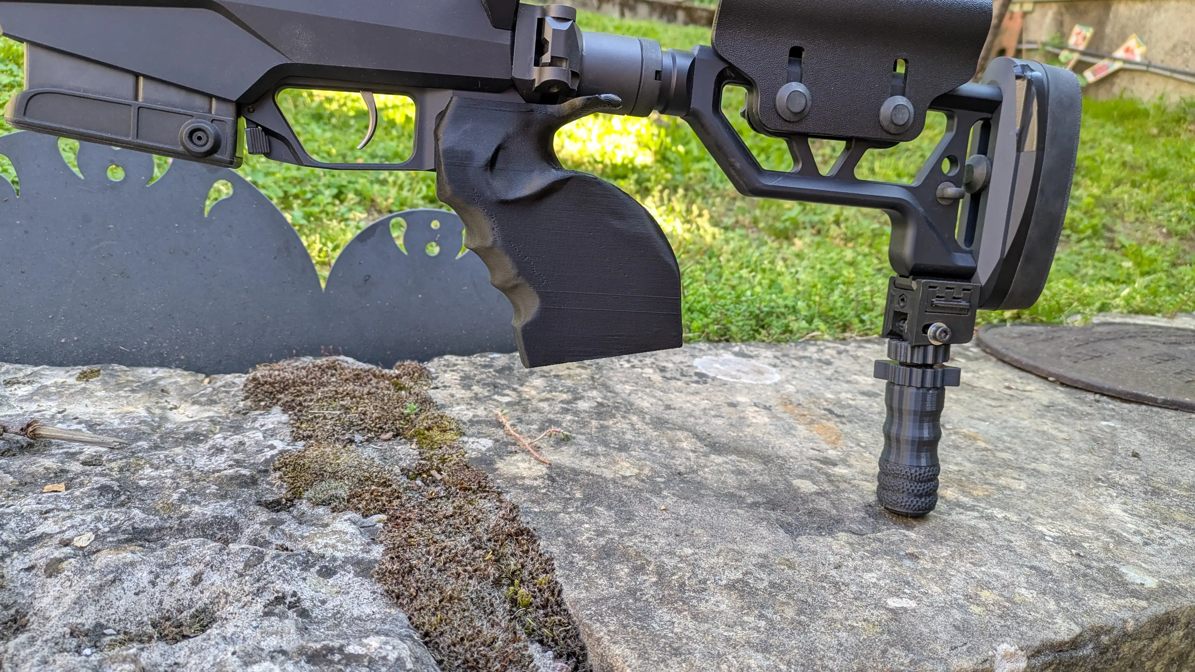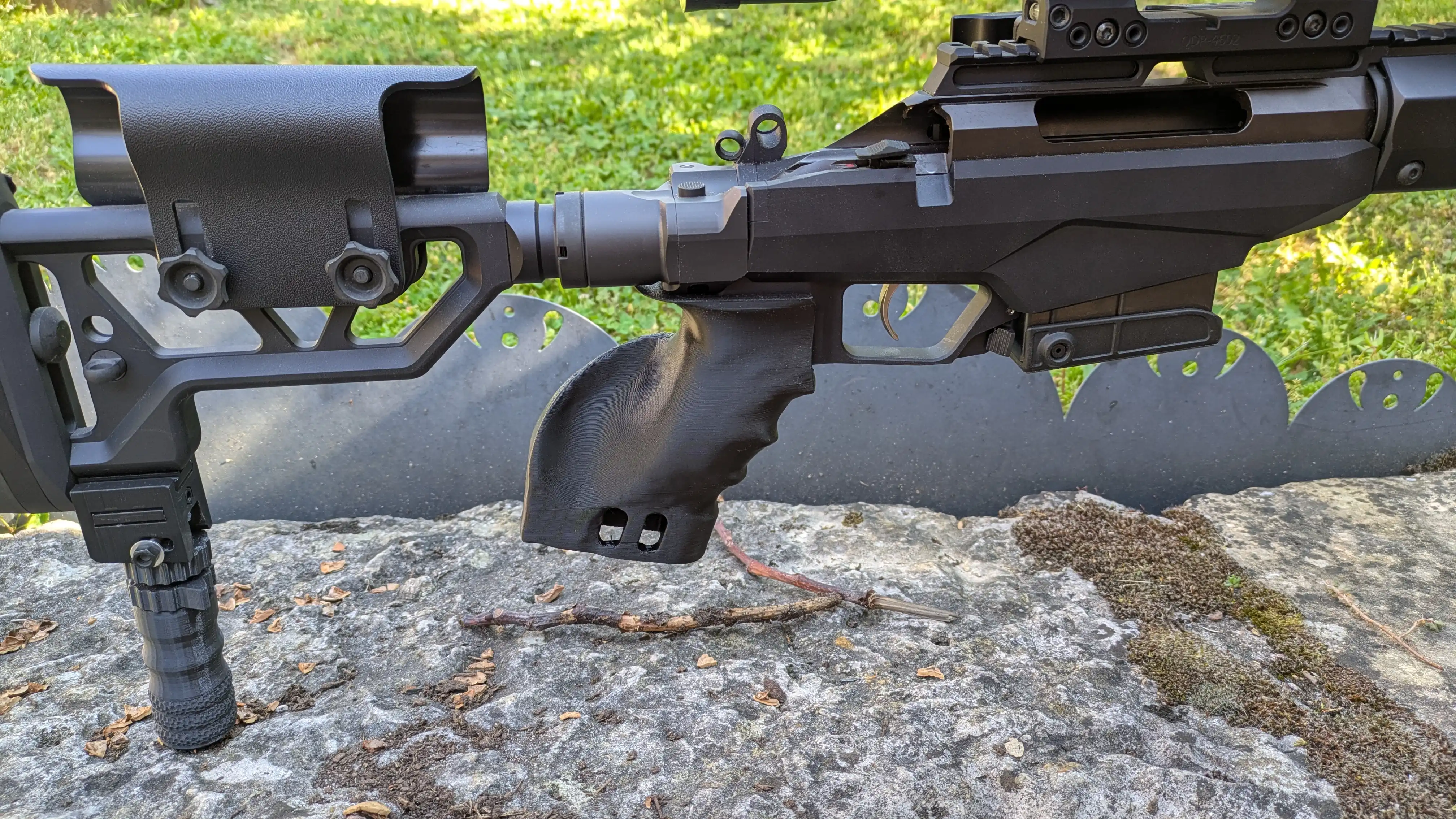 La poignée d’origine du T3x TAC A1 n’est pas conçue pour le tir de précision en position allongée. Cette crosse ergonomique corrige ça.