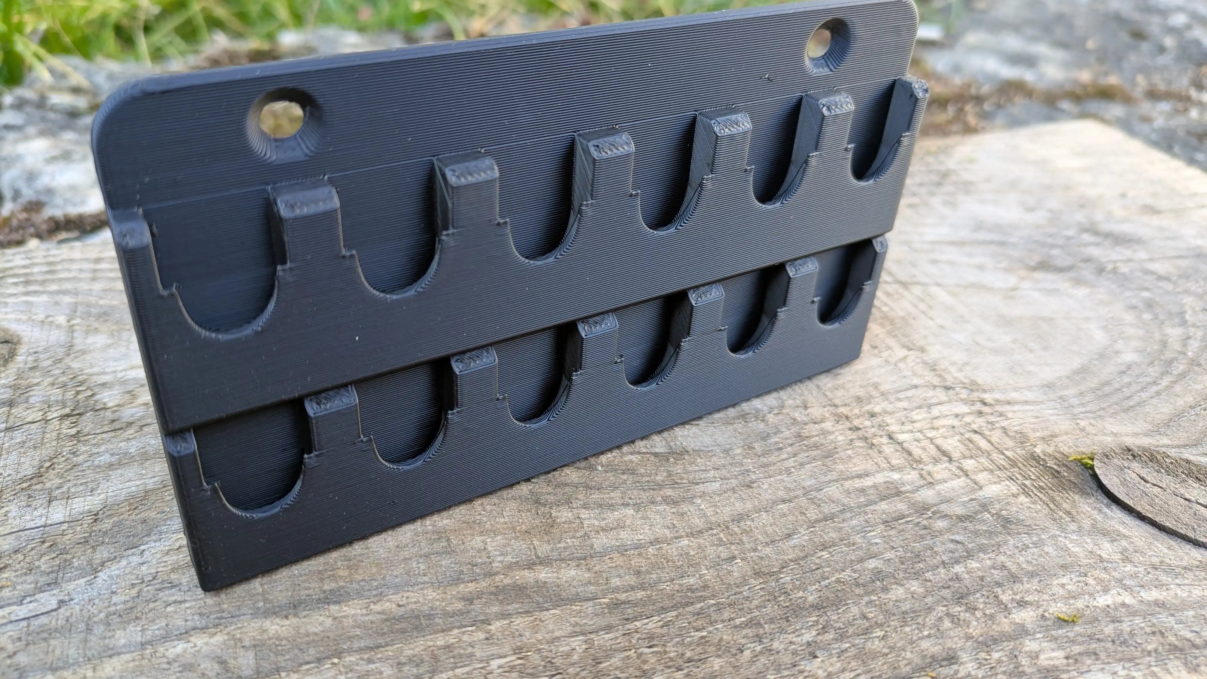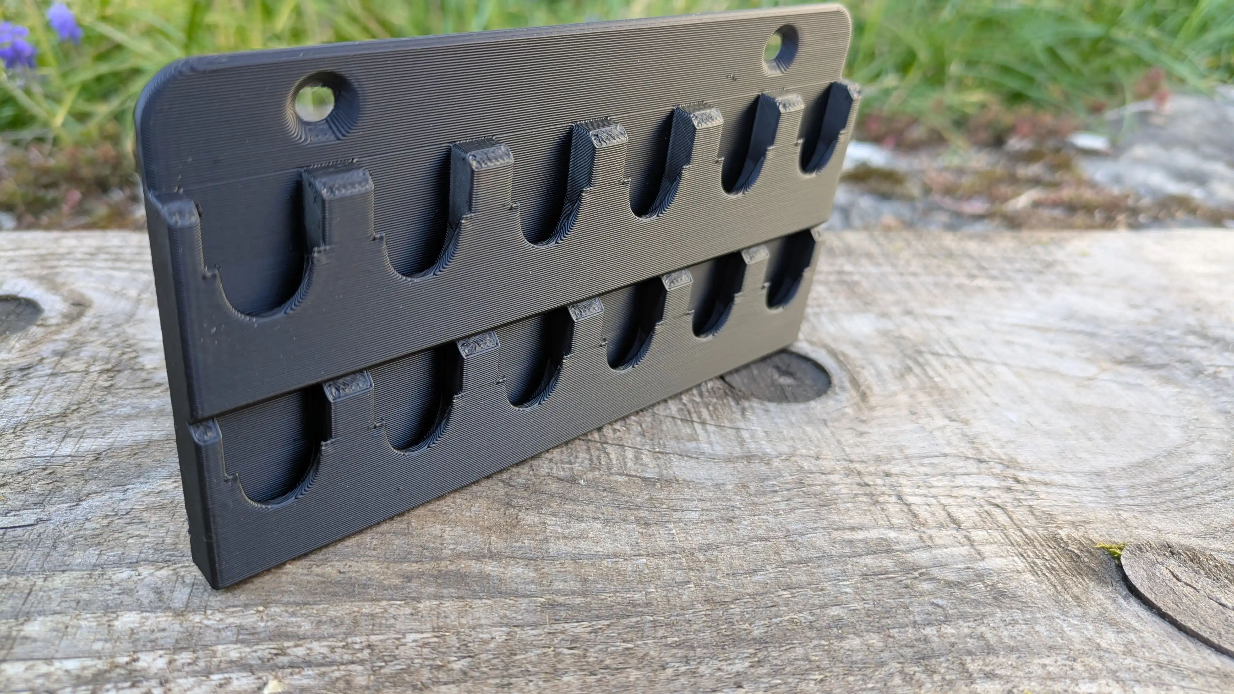 Deux trous de fixation permettent de visser le rack directement au mur, au panneau perforé, ou sur le côté de votre établi. Visserie non fournie — 2 vis à bois Ø4 mm suffisent.