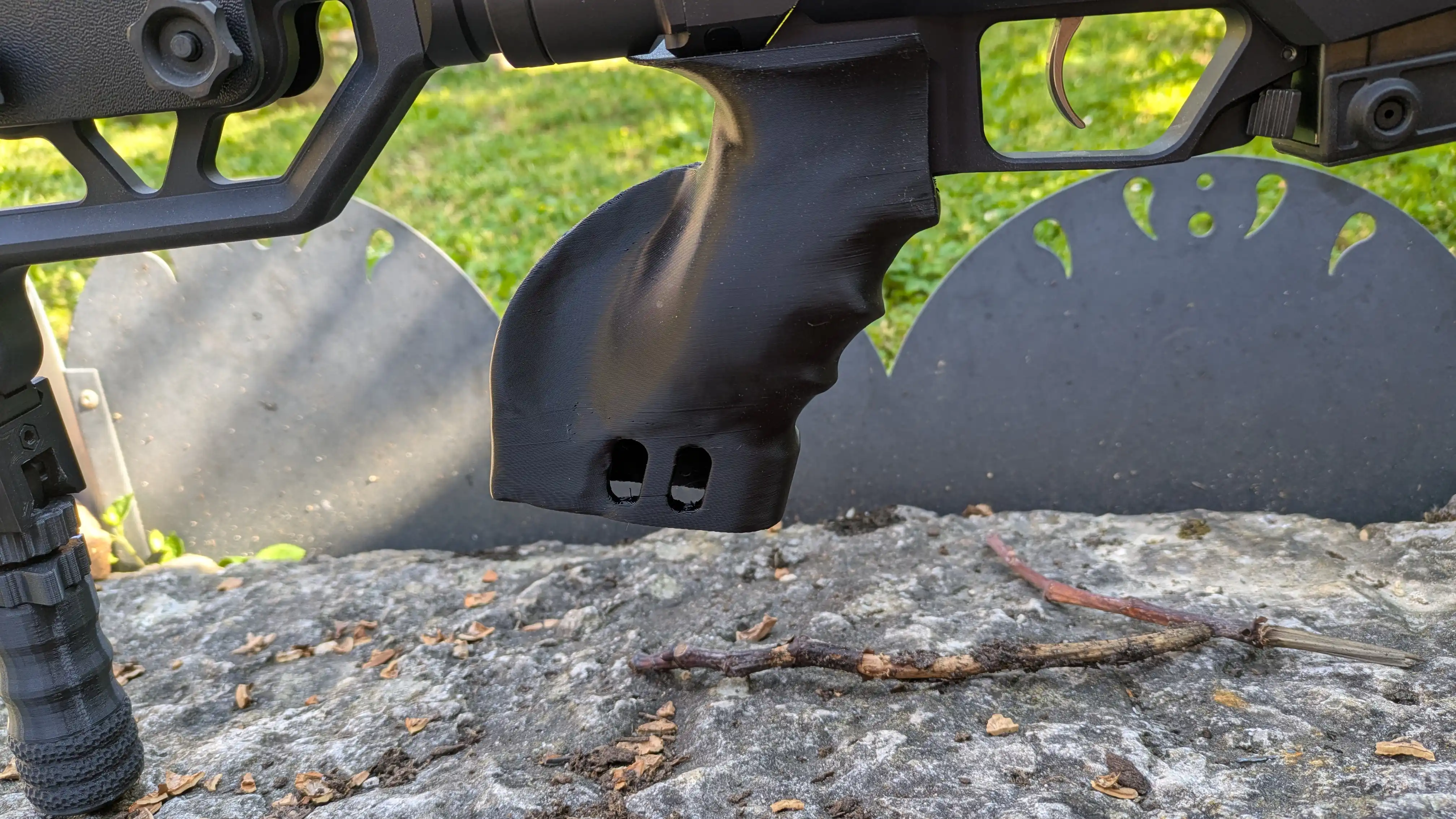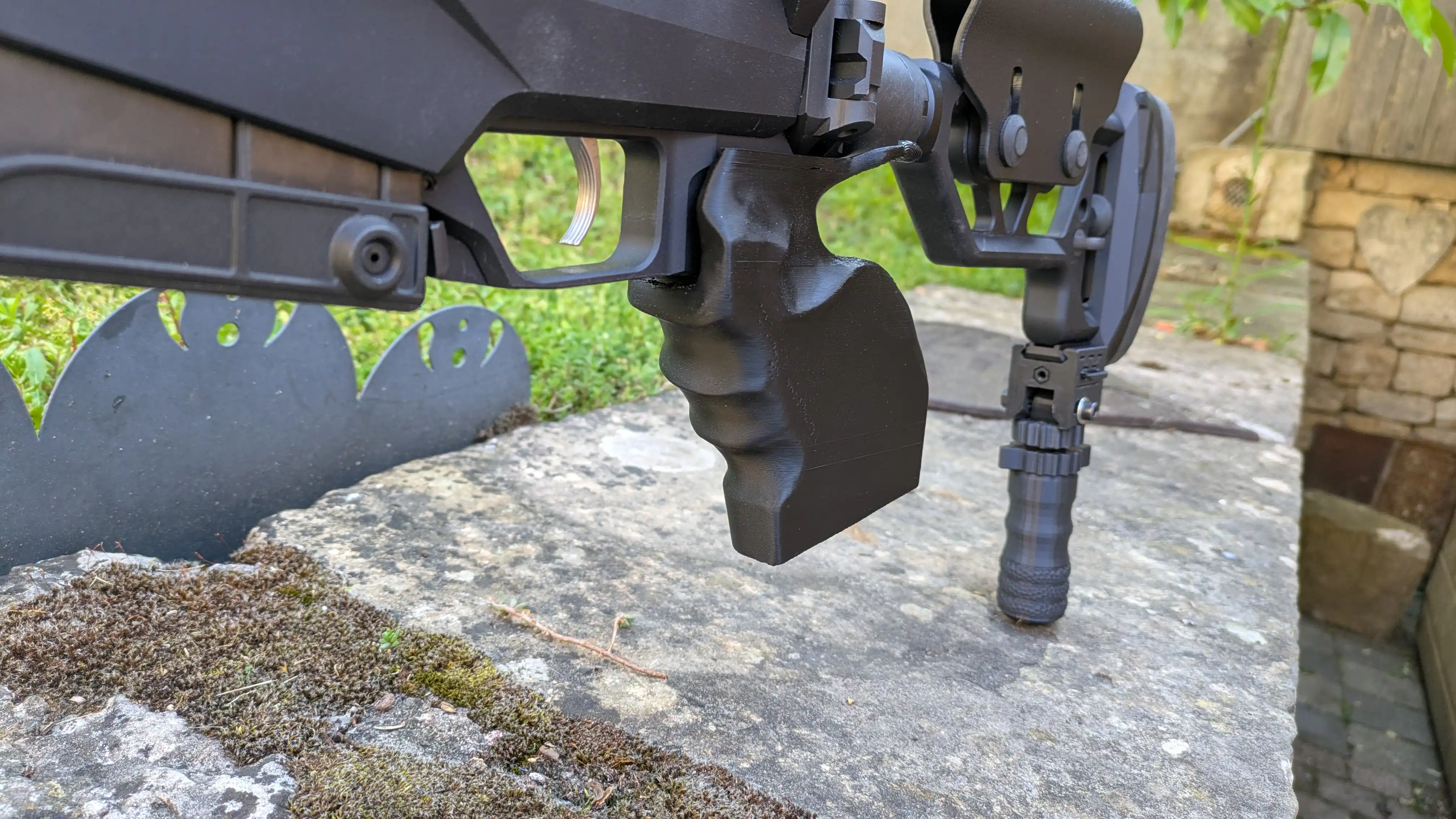 Dessinée spécifiquement pour le châssis T3x TAC A1, elle offre une prise en main verticale type AR-15 qui améliore l’alignement du poignet, réduit la fatigue sur les longues sessions et permet un meilleur contrôle de la détente en position bench-rest ou TLD couché.